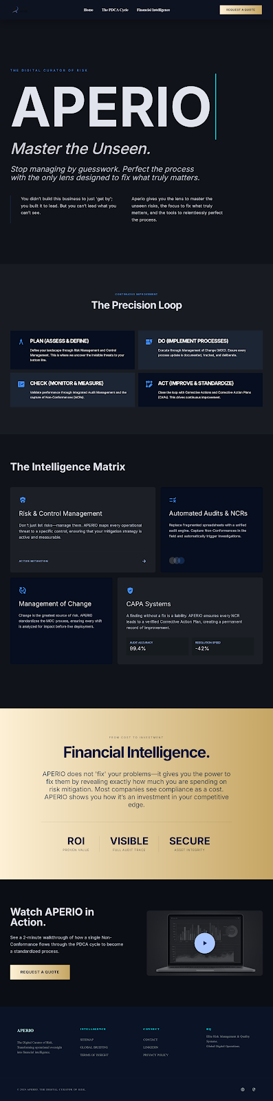 Aperio gives you the lens to master the unseen risks, the focus to fix what truly matters, and the tools to relentlessly perfect the process.
